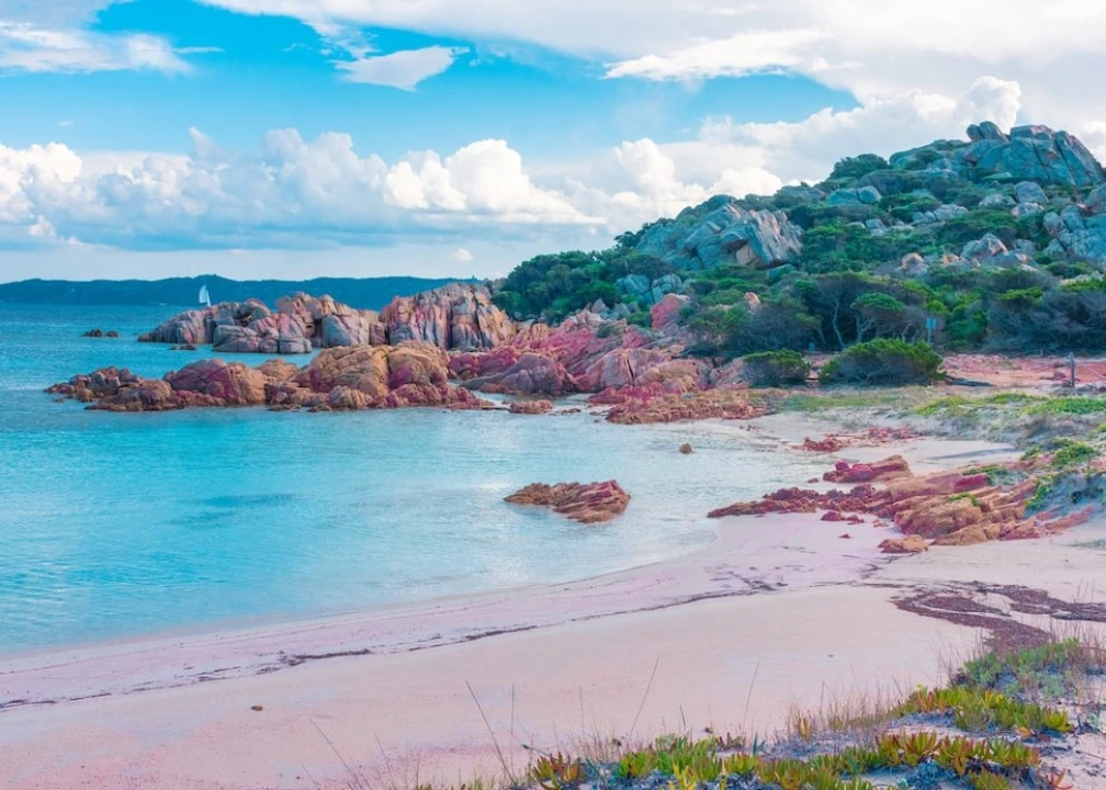 The whimsically blush pink beach of Budelli in the La Maddalena Archipelago owes its color to crushed fossils, crystals, coral, and mollusk shells. Since 1994 access to the beach has been strictly prohibited, and only permitted to be viewed from a distance, due to tourists stealing the sand from the beach—and losing the intensity of the pink-ness over time—when uncontrolled tourism picked up decades ago.