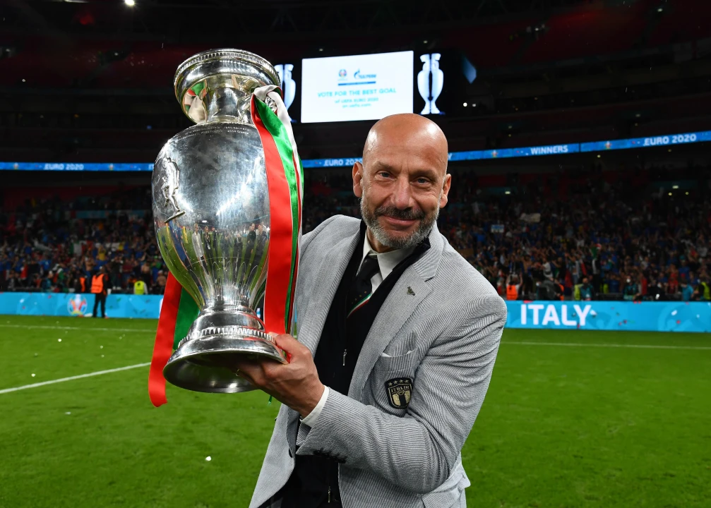 After his career as a player and coach, Vialli became a key resource for the Federation for years, providing all his experience and defying the illness diagnosed in 2017. Appointed in 2019 by the FIGC, along with Francesco Totti, Italian ambassador for the 2020 European Championship, a few months later he returns to the national team, this time in a different capacity. His is the post of head of delegation for the Azzurri coached by former teammate Roberto Mancini: officially manager, unofficially adviser and constant support for his fraternal friend. In the summer of 2021, he took part in the European championship won by Italy, an achievement that the players and the coach said they had achieved also thanks to Vialli, a fundamental figure in the locker room and an example of life for everyone.