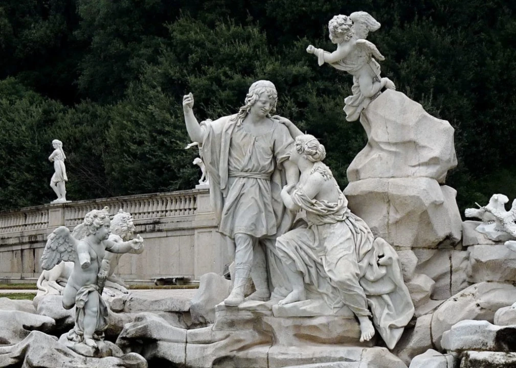 The Fountain of Venus and Adonis, sculpted in white Carrara marble by Gaetano Salomone between 1784 and 1789, stands out in the wonderful frame of the gardens of the Royal Palace of Caserta, a park extending over 120 hectares with English gardens and small woods.
