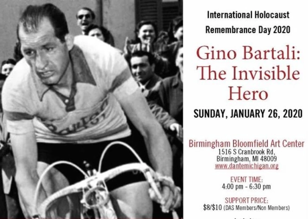 The Dante Alighieri Society of Michigan in collaboration with the Consulate of Italy in Detroit and Italian Cultural Institute of Chicago presents: Gino Bartali: The Invisible Hero. Three-time Giro champion helped save the lives of 800 Jews during the Holocaust. We invite you to a Meet and Greet with Special Guest Speaker: Gioia Bartali, grand-Daughter of Gino Bartali. Documentary screening : My Italian Secret: The Forgotten Heroes, by Oren Jacoby