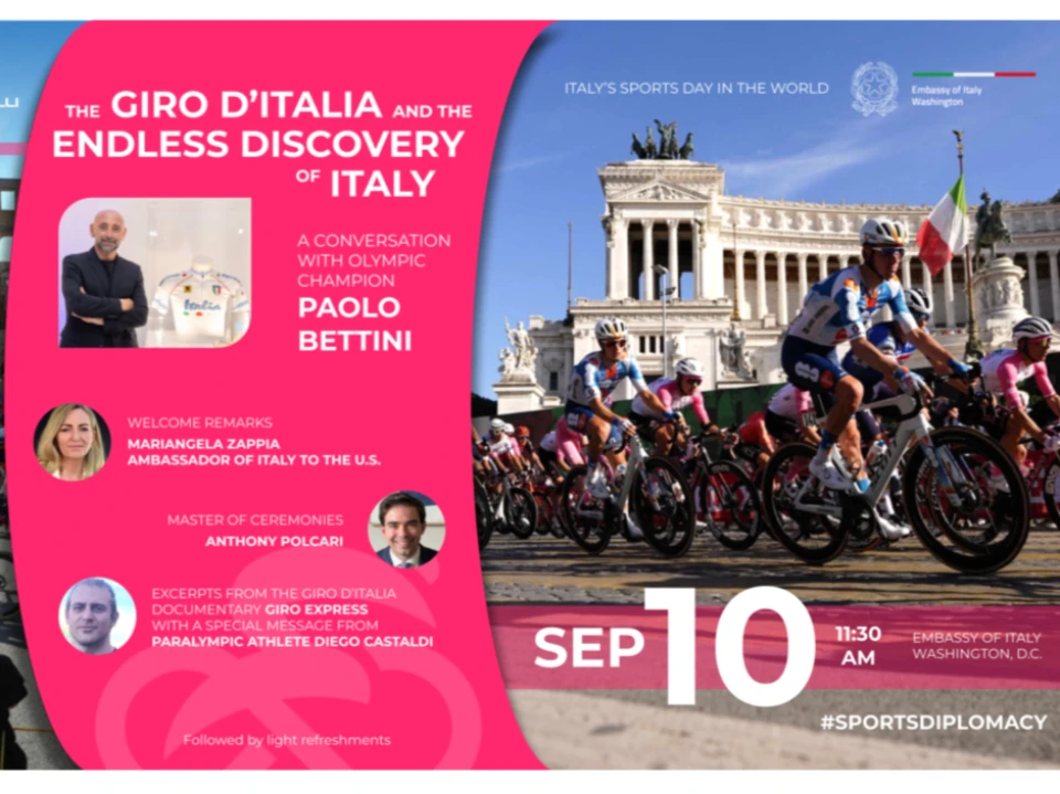 September 10, 2024 at 11:30 am. Embassy of Italy, 3000 Whitehaven Street NW, Washington, DC 20008. The Embassy of Italy in Washington is pleased to invite you to “The Giro d’Italia and the endless discovery of Italy”. Registration is required, please email here.