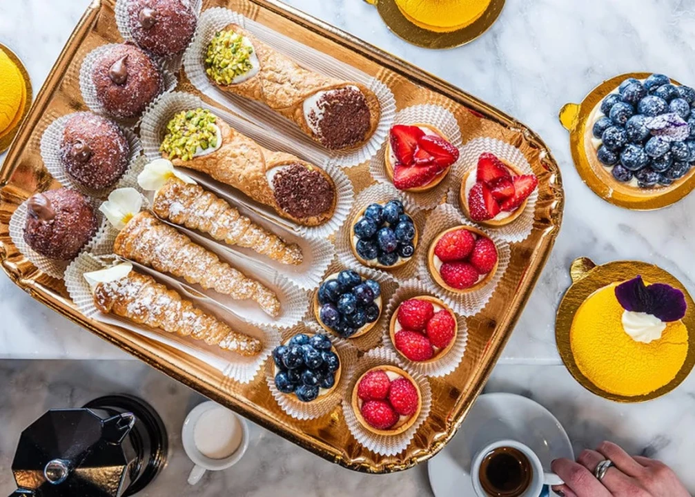 Dayron Santamaria, who used to work with Stellina partners Matteo Venini and Antonio Matarazzo at Lupo Verde, designed bomboloni doughnuts stuffed with Nutella, crema, and fruit that Venini says he used to eat religiously when he was growing up in Southern Italy. The stall also serves tray cakes, creamy panna cotta, cannoli, mille-feuille, rum babas, tiramisu, and other Italian pastries. In stylish Italian fashion, some desserts at the counter-service bakery are dressed with edible flowers and presented atop gold trays.