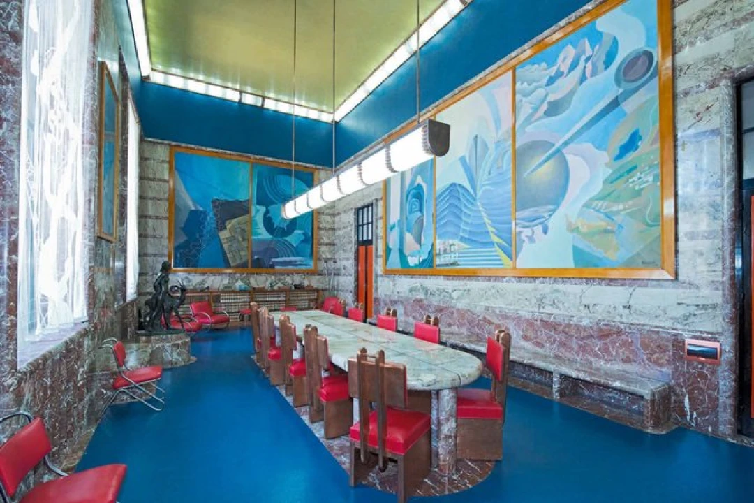 These rarely seen murals, which have adorned a conference room for decades, are both figurative and abstract, cast in shades of blue, with fluid and straight lines that play with perspective.