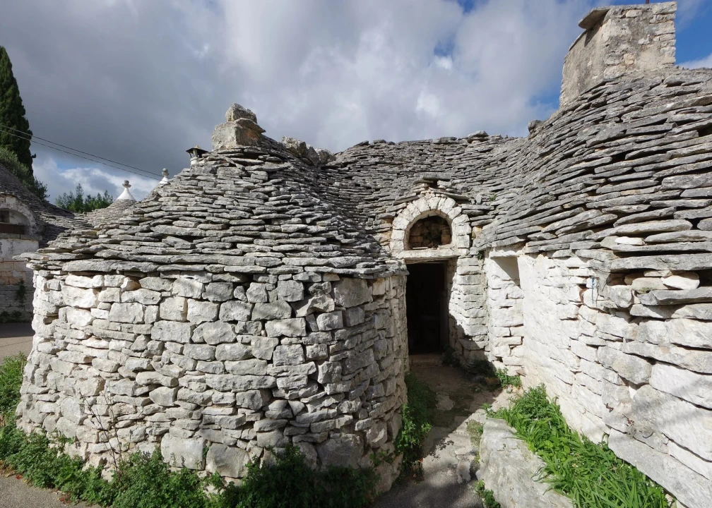 In the Southern Italian region of Puglia exist unique huts made of stacked stone. Similar in size and appearance to igloos (minus the snow and ice), they have cone-shaped roofs and are accessible via a small door. They are called trulli, deriving from the Latin word turris, which means tower. The particular huts are specific to the Itria Valley, in the Murge area of Puglia, that is in the area between Bari, Taranto, and Brindisi.