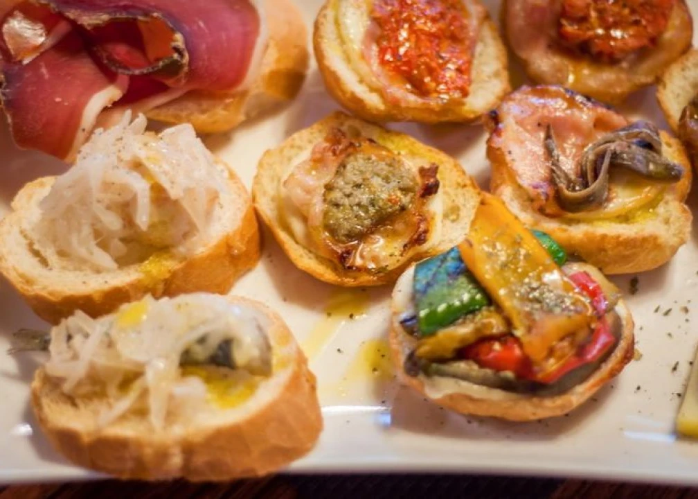 Common cicchetti include tiny sandwiches, plates of olives and vegetables, halved hard boiled eggs, deep-fried cheese, calamari, artichoke hearts, small servings of seafood, meat and vegetable ingredients laid on top of a slice of bread or polenta (classics include baccalà mantecato on top of white polenta and sarde in saor e polentina). All accompanied by little glasses of wine.