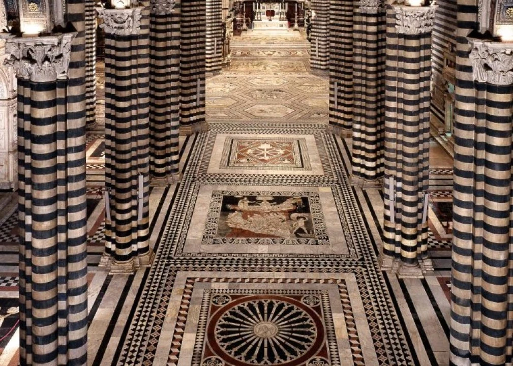 Il celebre pavimento a commesso marmoreo è unico per la tecnica utilizzata e per il messaggio delle figurazioni, un invito costante alla Sapienza. Secondo il Vasari si tratterebbe del pavimento “più bello…, grande e magnifico” che mai fosse stato fatto. Il risultato di un complesso programma iconografico realizzato attraverso i secoli, a partire dal Trecento fino all’Ottocento.