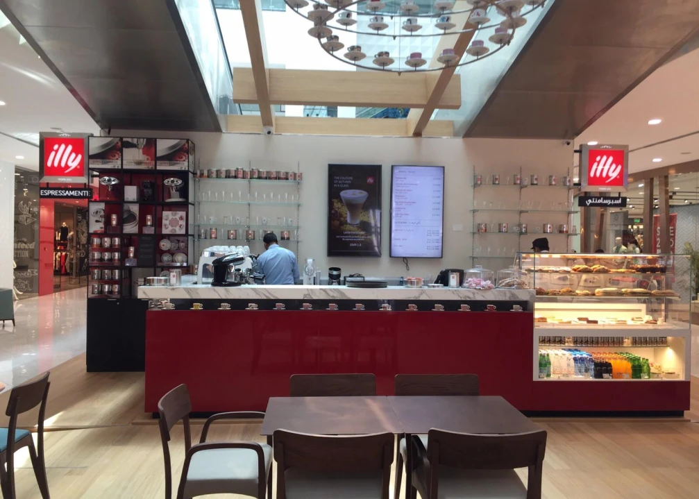 At the Ala Moana Center, the illy coffee bar is centrally located in a beautiful outdoor setting among top retail stores. The decor is a direct expression of the illy identity, featuring the iconic illy red color and use of natural materials, such as the Carrara marble countertops in addition to red tables, chairs and umbrellas that comprise a small seating area to enjoy an al fresco gelato, fresh pastry, or specialty coffee drink.