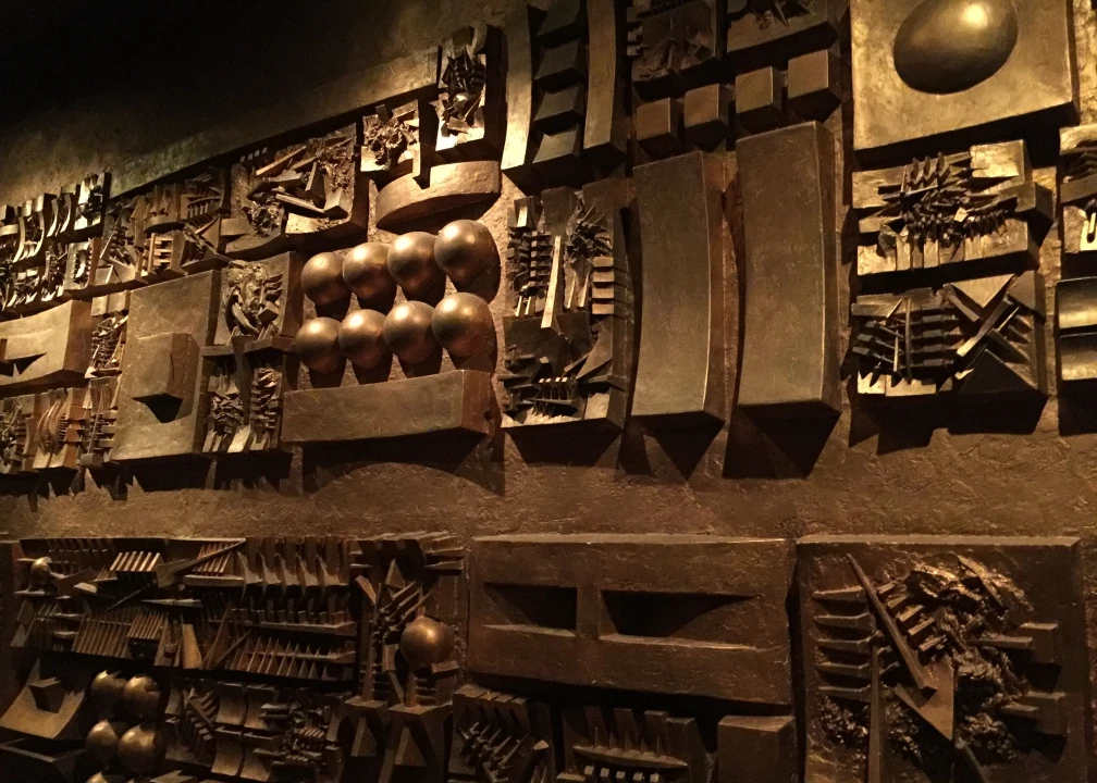 Built for the Galleria Giò Marconi in Milan, where a solo show of Pomodoro was held in 1995, in 1997 the Labyrinth was exhibited in the Medici Palace of San Leo in the Rimini province, Emilia Romagna. The atmosphere is inspired by the Epic of Gilgamesh, the first epic poem in human history, engraved on eleven clay tablets in cuneiform characters. Down the stairs, in fact, the entrance waits for us, face to face with the Door of the Seals. A wall-threshold on which are imprinted signs and reliefs with an abstract, symbolic value. A fundamental place of communication and understanding, representation of human drives.