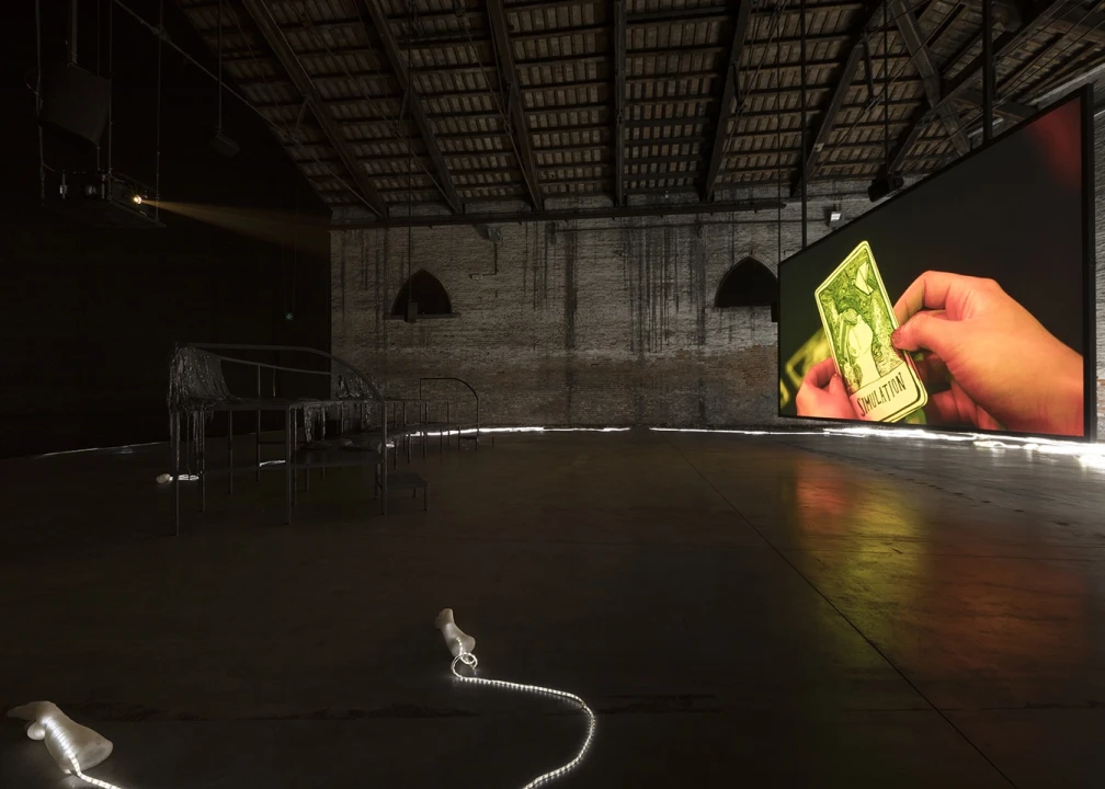 In The Reading / The Sitting, Husni-Bey films a group of guys who discover a deck of tarot cards designed by the artist, showing representations of contemporary issues related to the earth such as exploitation, threat, value and vulnerability. Illuminated silicone hands surround the crowd immersed in the dark as a symbol of grasping and personal consumption of each of us.