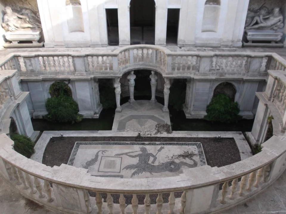 On the lower floor, amid polychrome marble and stucco decorations typical of the refined culture of the 16th century, the sinuous and enchanting figures of the Caryatids, witnesses to the ancient wealth of the Nymphaeum, stand out, supporting the travertine balcony.