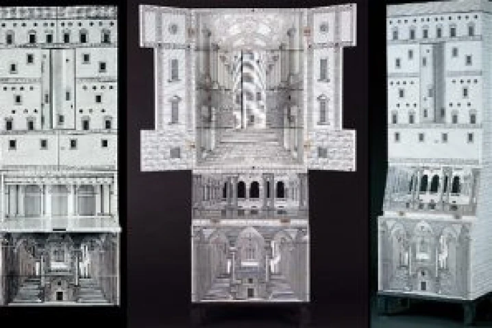 Twice, with two different themes, Fornasetti deals with an issue considered noble and high, like archeological printing, with a modern and almost pop interpretation. A drawing of the Roman imperial statuary, in a colored version in saturated hues, can be found in trays, screens, fabrics and libraries; while with the graphic rendering of the old prints of Italian archaeological taste like those of Antonio Tempesta or Piranesi, he even reaches a more widespread goal: combining the technique of silk-screen printing with wood, he manages to create cabinet shutters, doors and flaps, increasing the size of the prints but not losing their sharpness. From then on the taste of Cinquecentina (a booklet printed in '1500) will accompany thousands of Italians who will found it in cabinets, desks and bar counters.