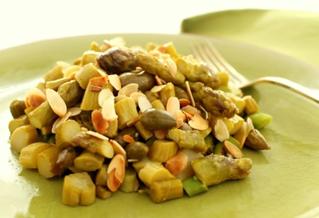 Let's celebrate spring with asparagus, a vegetable known for it's strong and distinct flavor. Asparagus, sliced and stir-fried, is a great base for a variety of dishes: first courses, entrees or side dishes. The addition of capers and toasted almonds in this recipe makes this vegetable extra special. Asparagus, belonging to garlic and onion family, shares the same diuretic properties. It is, therefore, a great ally in the spring to remove the toxins accumulated during the winter season.