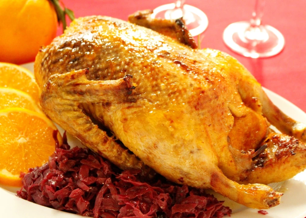 11. Remove from the oven. Let rest for 1-2 minutes and cut into pieces. Serve with the remaining orange sauce and sweet and sour red cabbage.