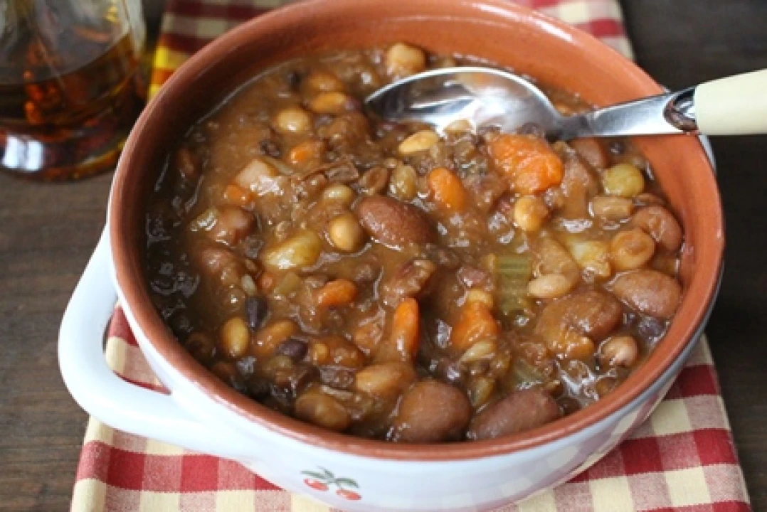 The recipe that I am proposing contains a mix of dried legumes such as beans, lentils, soybeans, chickpeas, peas and beans. And to make this dish even more tasty, I prepare a soffritto with onion, garlic, celery and carrot. The preparation is very simple, but it requires a bit of time, because legumes have to be soaked in water before cooking. To save time you can use a pressure cooker, which reduces the preparation time without sacrificing taste. You can top this soup with croutons or grated Parmesan cheese or, if you prefer, you can put a few drops of hot chili olive oil before serving.