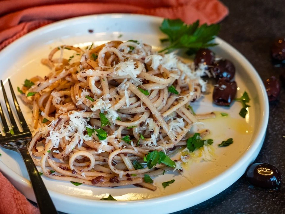 3) When pasta is cooked, drain it and reserve ¼ cup of the hot water. Return the linguine to the pan and scoop in the tapenade. Use tongs to coat the pasta well. Plate on individual plates or a large bowl. Garnish with pecorino cheese and parsley and serve hot.