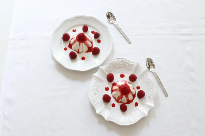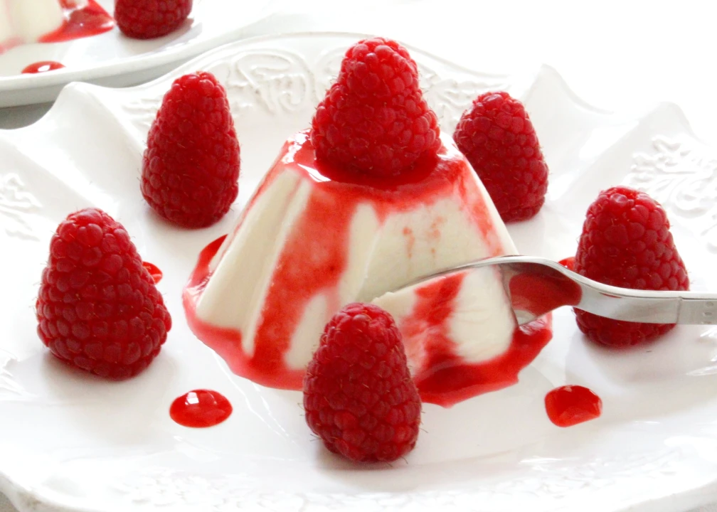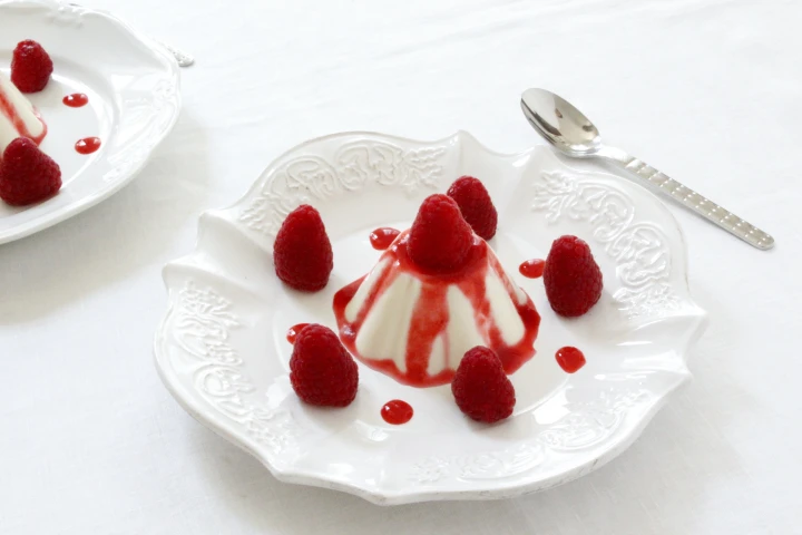 5. Turn the panna cotta out on a plate and garnish as you like. I love it with berries, in particular raspberries. Check Semifreddo al pistacchio for the red-raspberry sauce recipe. I use half of the berries for the sauce and the rest for garnishing. You can also enjoy with only just fresh berries.