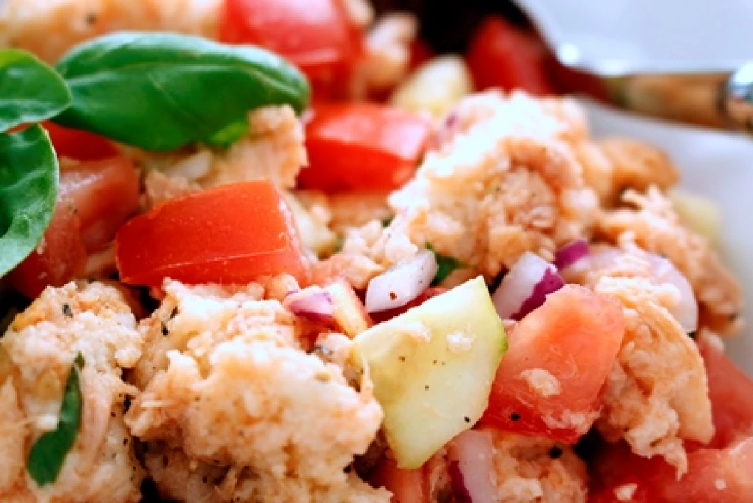 Panzanella is a cold salad, full of summer flavors. It originated in Florence and had conquered all of Tuscany by the beginning of the nineteenth century. It is a rustic dish with a peasant birthright. In the past panzanella was made with basic ingredients such as crusty, day-old bread, tomatoes, onions and fresh basil tossed with a vinaigrette dressing. It is an example of how people did not waste any food....there was not a lot!