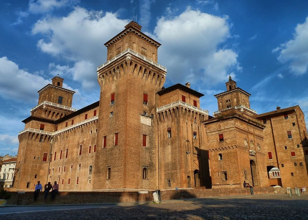 The old town center is one of the best-preserved examples of a Medieval city, dotted with several monuments, churches, cloisters, green expanses, historic buildings and palazzi; first and foremost among them is the Estense Castle. Built on a 1385 commission by Niccolò II d'Este, the castle was a square brick defensive fortress with 4 towers and surrounded by a moat. During the seigniory of Ercole I d'Este, the castle became the residence of the Court; it was thus embellished with elegant balconies, and the towers refined.