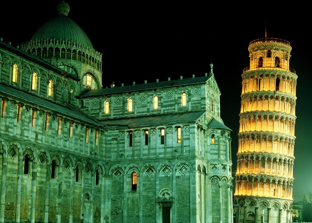 The Tower’s magnificence, adjacent to the Cathedral of Santa Maria, stands out from the skyline of the other edifices in the piazza, appearing suspended above a green cloud (that is, the grassy knoll on which they reside). The Baptistery, or the site of Catholic baptism; the Cathedral, symbol of spiritual elevation; and the old graveyard (camposanto), a final resting place; represent, according to some, a sort of cosmic calendar: birth, life and death. The Cathedral or Duomo, and the Baptistery, all white in color, are an unrivaled example of the Pisan Romanesque, particularly because the interior of the church features contrasting Arabesque influences.