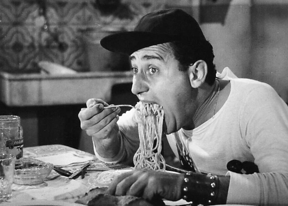 What about that famous picture of a man wearing a cap and eating with greed a huge dish of pasta, pronouncing one of the most famous jokes in the history of Italian cinema, which is actually in Roman dialect: “Maccarone, tu m’hai provocato, e io me te magno” (Maccarone, you provoked me and now I'm gonna eat you)...?