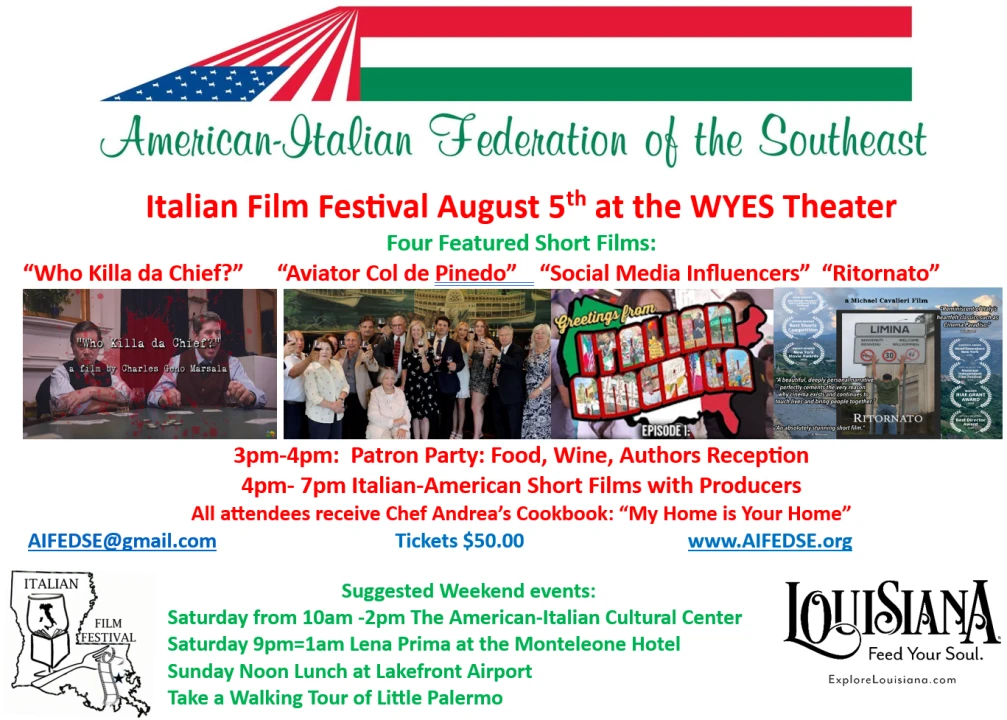 The American-Italian Federation of the Southeast is hosting a film festival August 5th from 3-7pm at WYES. Four films - each 30-minutes in length will be shown with Q&A to follow each film. Patron’s Party includes Sicilian Wine tasting from 3-4pm. Chef Andrea has donated a copy of his book "La Cucina di Andrea's" for patrons. Tickets can be purchased on EventBrite.