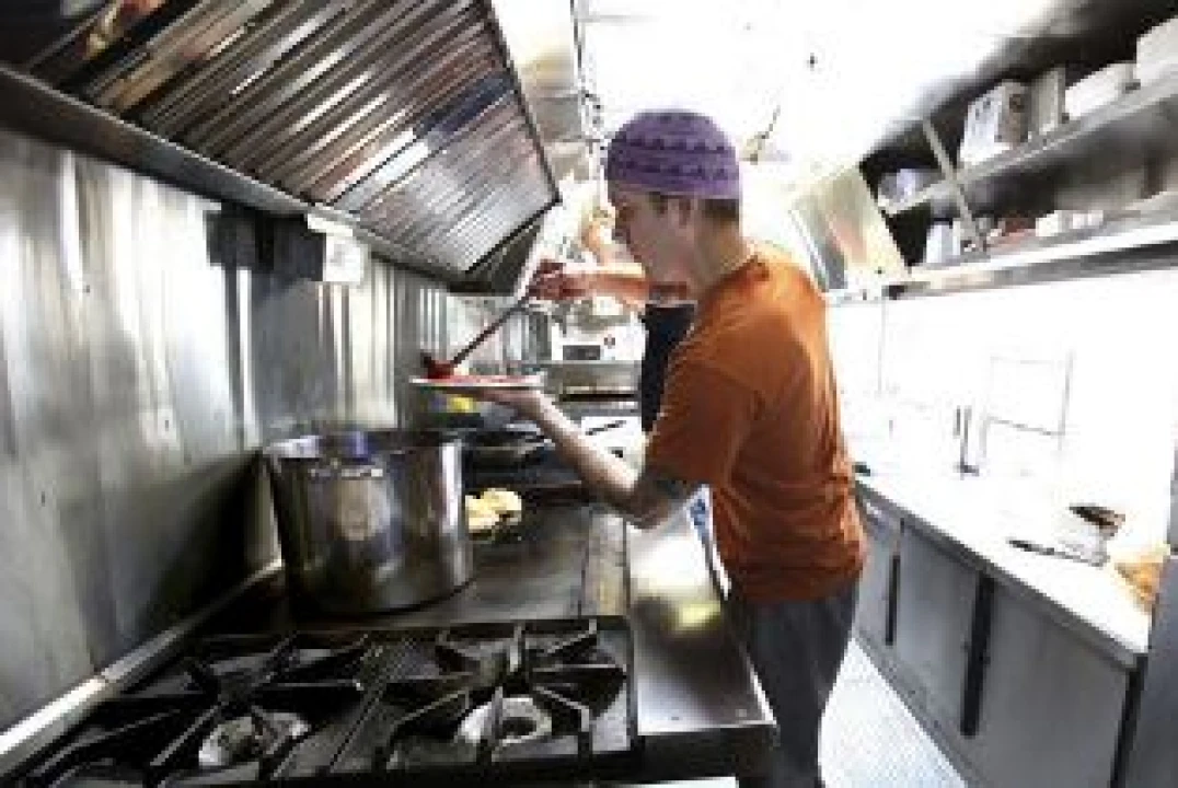 At 36 feet, the mobile kitchen is significantly larger than most food trucks and comes equipped with a fryer, two burners, a flattop grill, two full-sized ovens, a proofing oven, and other amenities, allowing the crew to feed a small army in one sitting.