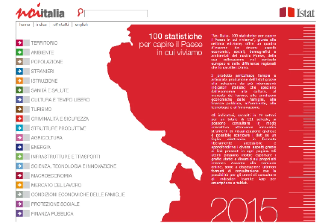 The National Institute for Statistics (Istat) has released its report called "Noi Italia. 100 statistiche per capire il Paese in cui viviamo" (Noi Italia. 100 stats to understand the Country we're living in"). The report provides an overview of the various economic, social, demographic and environmental characteristics of our country, of its position in the European context and the regional differences that characterize it.