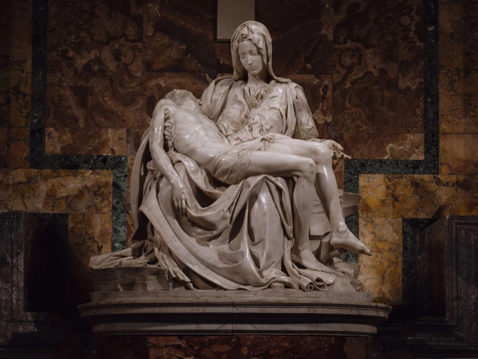 From 1501 to 1504, Michelangelo’s amazing artistic ability enabled his sculpting the biblical David, which to this day stands alone in the Rotunda of the Accademia in Florence. When one stands before David, one is in awe of the lifelike details, experiencing the majesty not only of his steadied gaze but also of his anatomy with visible veins and musculature. It is an emotional moment realizing this lifelike figure emerged from one block of marble. One feels the marble come alive, carved by a true genius. Leading up to the David, the corridor is lined by the four Slave-Prisoner statues, those emerging from the stone, as if trying to be free but still bound by the marble, purposefully unfinished to underscore the struggle. Michelangelo’s Pietà, depicting Mary holding the crucified Christ, also evokes its sorrow. This ability to bring forth emotion from the viewer was also genius. To think Michelangelo was only twenty-four years old when he completed this moving depiction.