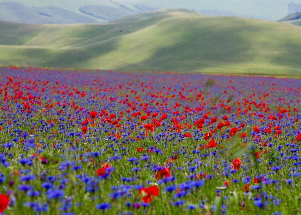 During the warm months of every year, the valley of Castelluccio in the province of Umbria, Italy, explodes in colour with the bloom of thousands of flowers, forming the "Fiorita," or natural flower show. Among them are poppies, violets, daisies, and cornflowers.