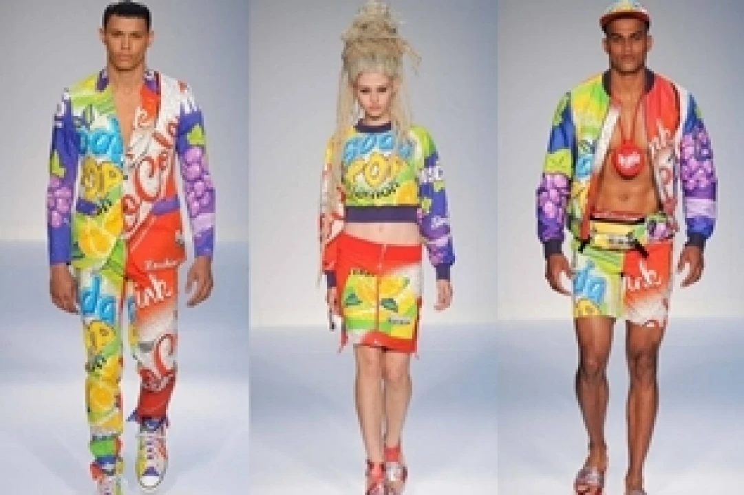 The tribute to the consumerist society comes back, and this time Moschino winks at Coca-Cola, inventing "soda pop" styles with tastes such as lime, grape and cola, with the motto "drink Moschino."