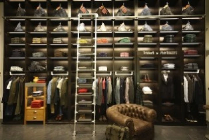 Large arches frame crystalline windows that peer into the boutique, showing off the large iron cast spiral staircase, its hardwood banister and the historic brick walls that surround it. Jeans, jumpsuits, jumpers, t-shirts and accessories decorate the contemporary dark wood shelves and white steel rails, elegantly framed by a rolling library ladder. It seems that the boutique itself is a symbol of the Roy Roger's brand, where history paves the way to the future.