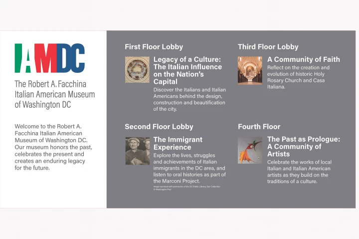 Entrando nell'atrio del primo piano, c'è una bella e grande mappa a muro di Washington DC che indica 30 dei molti siti che sono stati creati o in qualche modo toccati da mani italiane. Alcuni esempi: la statua di Dante, scolpita da uno scultore siciliano, si trova in un parco cittadino; le sei statue di fronte alla Union Station furono scolpite nel 1910 da Andrew Bernasconi, i cui discendenti sono ancora in zona; e l'enorme statua di Lincoln nel Lincoln Memorial fu scolpita dai fratelli Piccirilli, che fecero numerose altre sculture in tutta la città. La nostra mappa include anche vari musei della città con le loro eccezionali collezioni di arte e manufatti italiani.