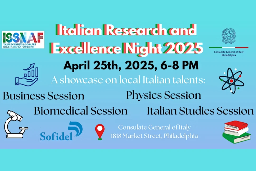 The Consulate General of Italy in Philadelphia is pleased to host the 2025 edition of the Research and Excellence Night on April 25th, 2025 from 6 to 8 PM at 1818 Market Street, 9th floor, Philadelphia.