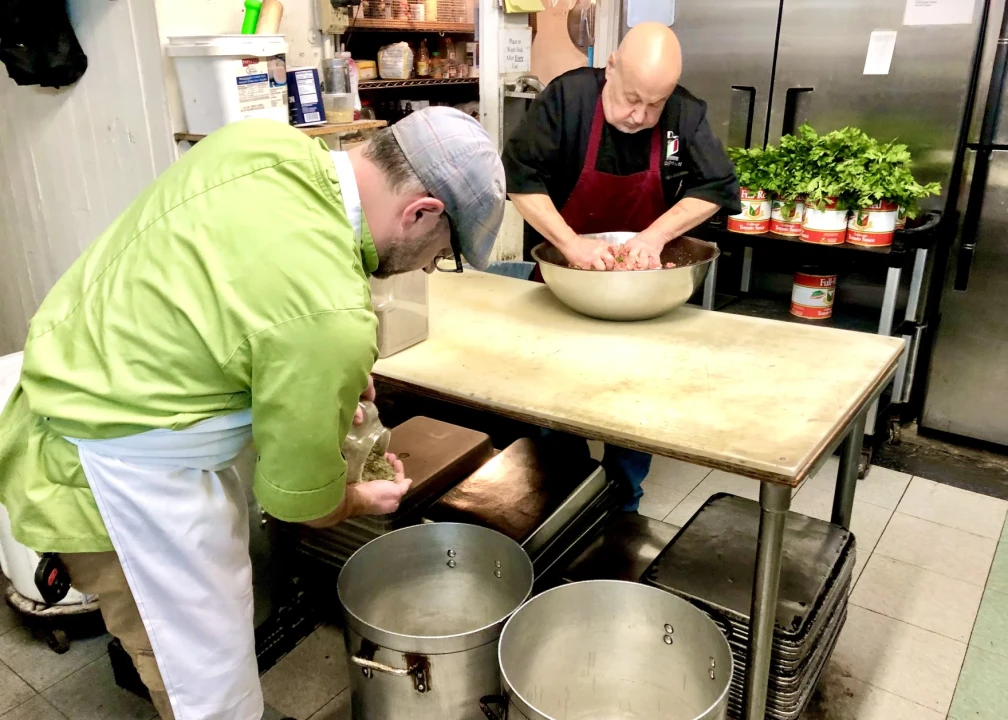 The first order of business every morning is making the spaghetti sauce, or gravy as it’s called. Three giant pots of it are cooked nearly every day. Rudi and Mario measure the ingredients by sight -- in handfuls and bunches. It’s tasty, but not fancy.
