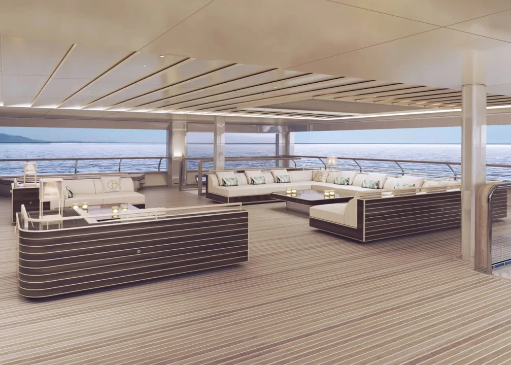 Exterior features include "geometric volumes" balanced by "curvier, softer shapes" and full-height openings that can be adjusted using sliding panels, according to the shipyard. The interior is by Armani/Casa and uses a soft and minimalist palette that contrasts the use of refined materials and hand-crafted finishes. The first interior renderings show polished marble floors with gold accents and occasional use of dark wood.