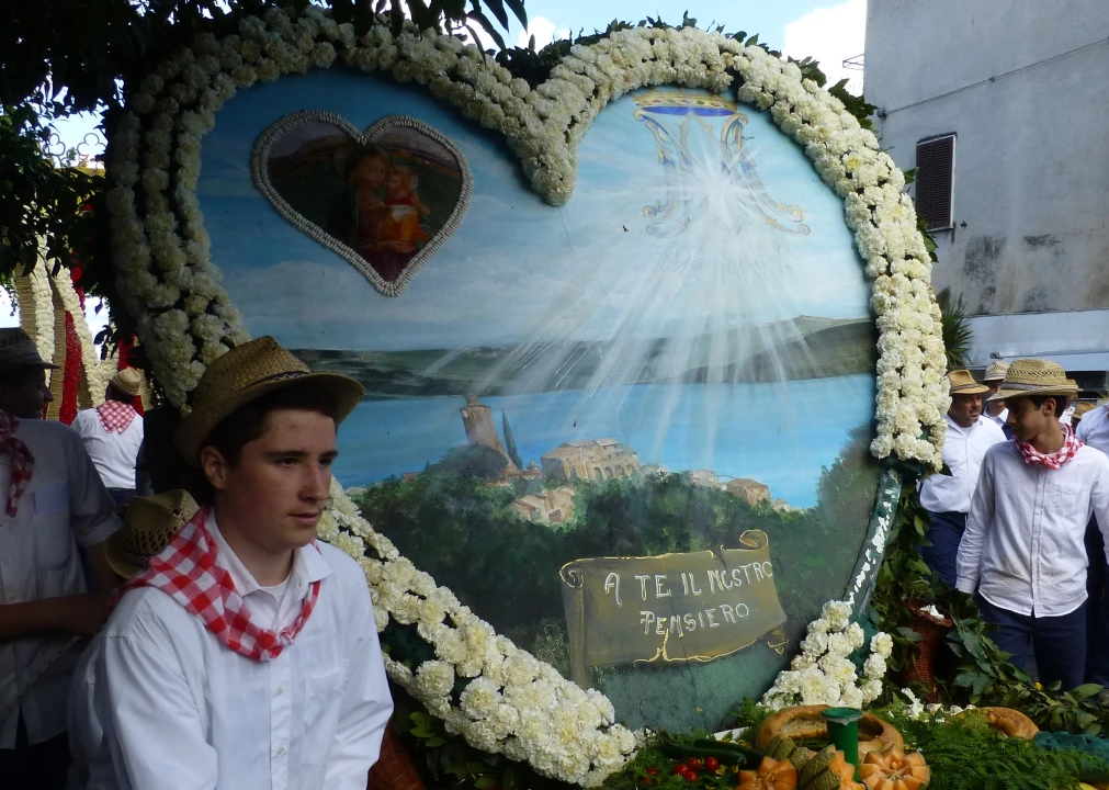 The interesting thing is that only the men who prostrate themselves before the Madonna can participate, first during the parade of floats, and then during the “passata”, the second phase of the feast. We can see all the men of the house parading: in each float there is the old man, the son, the grandson. During the "passate", the three turns that are made on foot in and out of the church, in a sort of procession of the entire categories of workers, the faithful are sprinkled with flowers, rose petals, broom, fragrant herbs and are offered to Our Lady baskets of fruit, wheat, cheese, fish. The altar of Mary becomes rich with gifts: even if this is a pagan feast, not a Christian one, it truly celebrates her, the Virgin Mary, the Mother of the universe, fertility and abundance to which men cry, beg in a sincere love, deep and grateful: "Hurray Mary! Praised be the Most Holy Sacrament! Long live Our Blessed Lady of the Mount!"