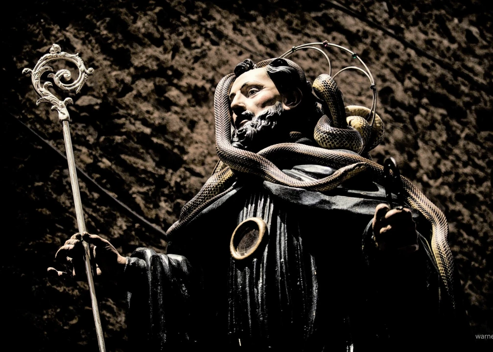In reality, this Saint was born in Foligno (Umbria) in 951 and died in Sora (Lazio) in 1031. This is a typical character who lived in the Benedictine monastic spirituality and founded hermitages in the area of Abruzzo and Lazio. A character who would have been shipwrecked in the medieval hagiography if he had not been associated to a very important tradition: the feast of the snakes. The snake is linked to the domination of poisonous snakes, or rather to the "animic" control of the unconscious.