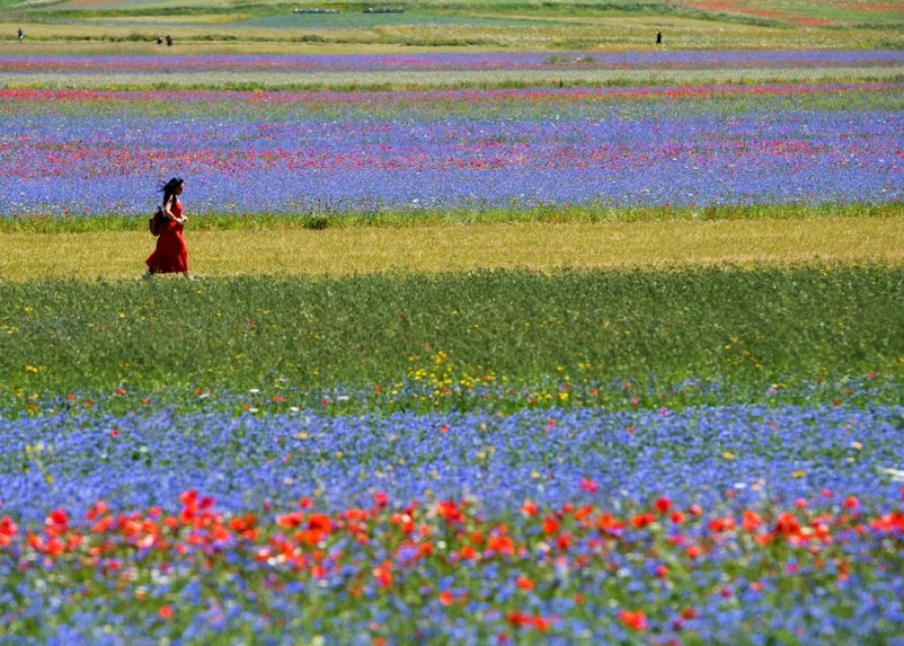 Poppies, cornflowers, daisies, violets and others paint the fields in rainbow hues, and tourists flock to take in the sight from the Apennine's highest village. La fioritura takes place in the Piano Grande – 'Great Plain' – beneath the Sibillini Mountains, in the summer months between late May and July.