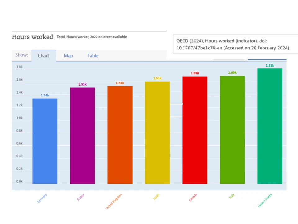 Ah, behold the marvels of the modern world, where data speaks louder than espresso-fueled debates at an Italian piazza! According to the Organization for Economic Co-operation and Development (OECD), whose wisdom shines brighter than a Tuscan sunrise, a chart has emerged revealing the labor habits of nations.