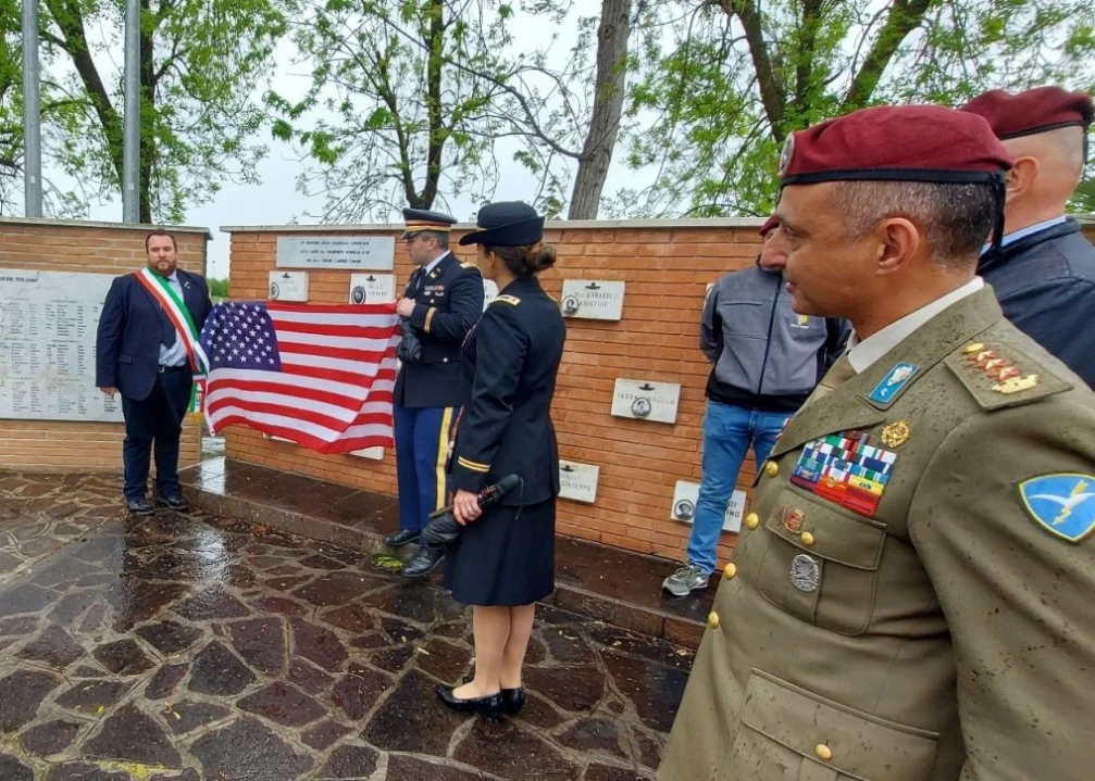 Soldiers from U.S. Army Garrison Italy helped people from a small Italian community recognize World War II pilots during an April 24 remembrance ceremony. Members of Headquarters and Headquarters Company, wearing dress uniforms, joined Italian paratroopers – currently serving and veterans – plus other community members to unveil a plaque commemorating Operation Herring.