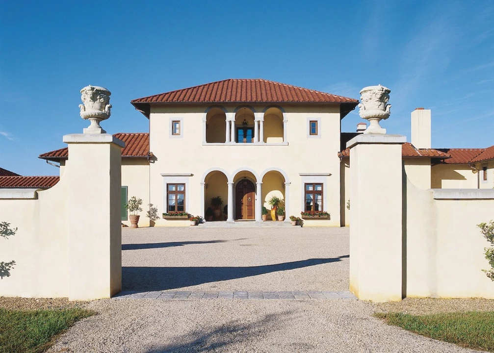 Steeped in history but brand new, Rex and Jane Scatena's Free Union villa and vineyard Tra Vigne is a Grand Tour in an afternoon. Vicenza, the legendary land of Palladio, yielded the soft stone that makes up every interior and exterior door and window surround. Venetian glassblowers made the thousands of flowers and leaves for the massive chandeliers. A stop in Positano hotel inspired the floor designs and a centuries-old brick maker in the Southern Italian town of Salerno hand-made very cotto tile.