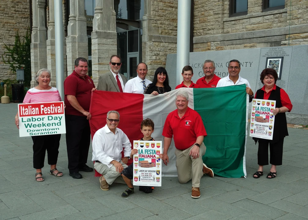 Some of the board members, committee volunteers and civic officials associated with La Festa Italiana raise the Italian flag on Courthouse Square in downtown Scranton, site of the festival to be held Labor Day Weekend beginning this Friday, Aug. 31, at 4 p.m. and continuing through Monday, Sept. 3 until 8 p.m. For more information, the entertainment schedule and updates, visit the festival Web site at:www.lafestaitaliana.org.
