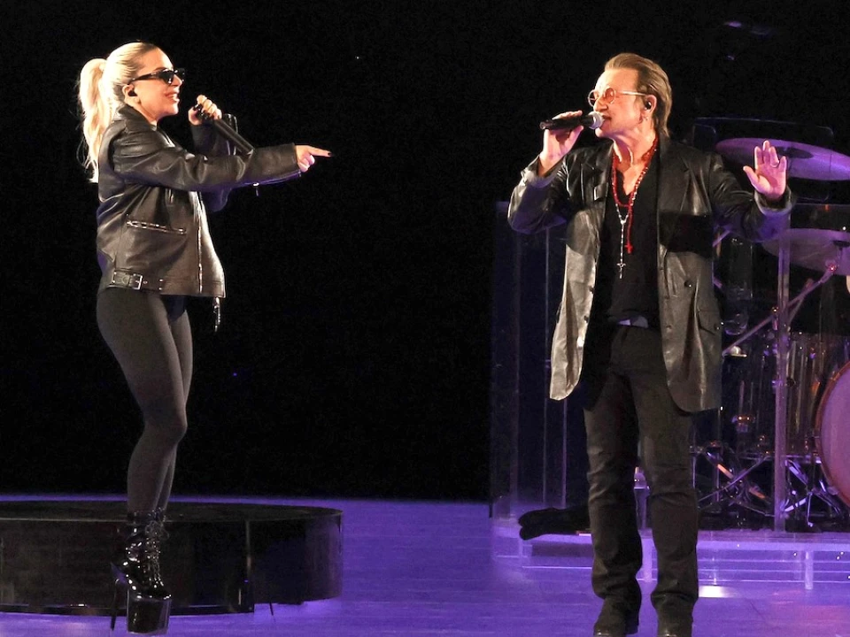 Bono introduced his fellow leather-jacketed guest as “the most audacious, vivacious woman in any room she’s ever in. Would you welcome to our turntable, the divine — the divinyl! — Lady Gaga.” He wasn’t done praising her divinity. “Take it to the Elvis chapel!” exulted Bono in a breakdown in the middle of “I Still Haven’t Found What I’m Looking For” — further telling his duet partner, “You are the vestal virgin of Las Vegas!”