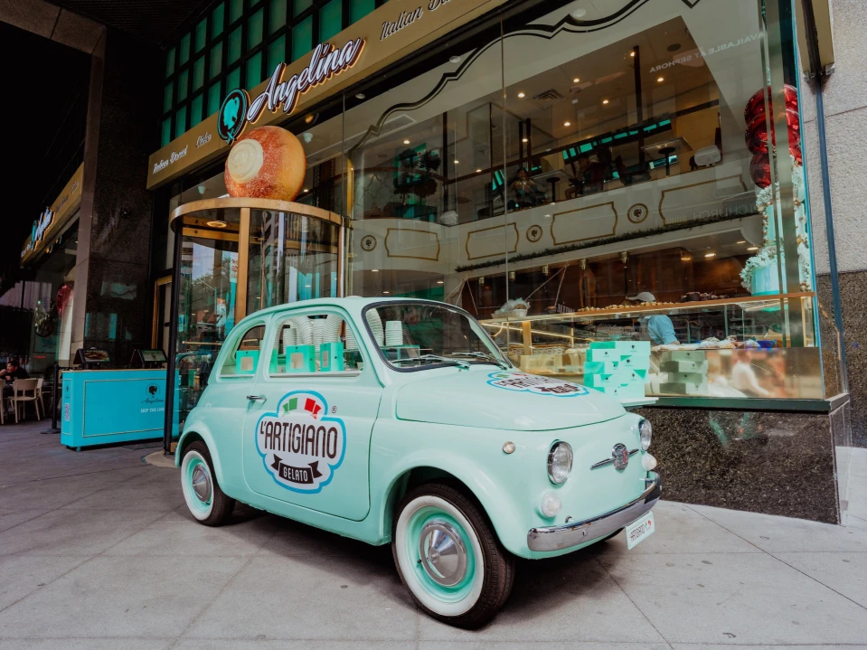 Building on the successful launches at The Shops of Columbus Circle and Fort Lee Park, L’Artigiano’s Fiat 500 Gelateria – a vintage Fiat 500, or “Cinquecento,” reimagined as a gelato cart – has officially debuted at another prime location: 52nd & Broadway in Manhattan, partnering with Angelina Bakery, famous for its delicious Bomboloni and Italian coffee—a sensational pairing!