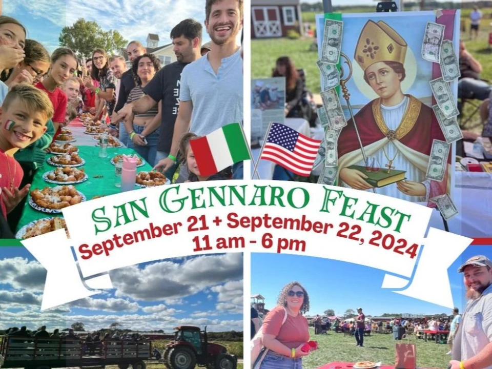 Sat Sep 21, 2024 - Sun Sep 22, 2024. 11:00am to 6:00pm ET. Lenny Bruno Farms - 740 Wading River Road, Manorville, NY, 11949. Price: $10 per person, children 2 and under FREE. Lenny Bruno Farms' Annual San Gennaro Feast is a two-day event celebrating Italian-American culture, delicious cuisine, and the beauty of the farm.