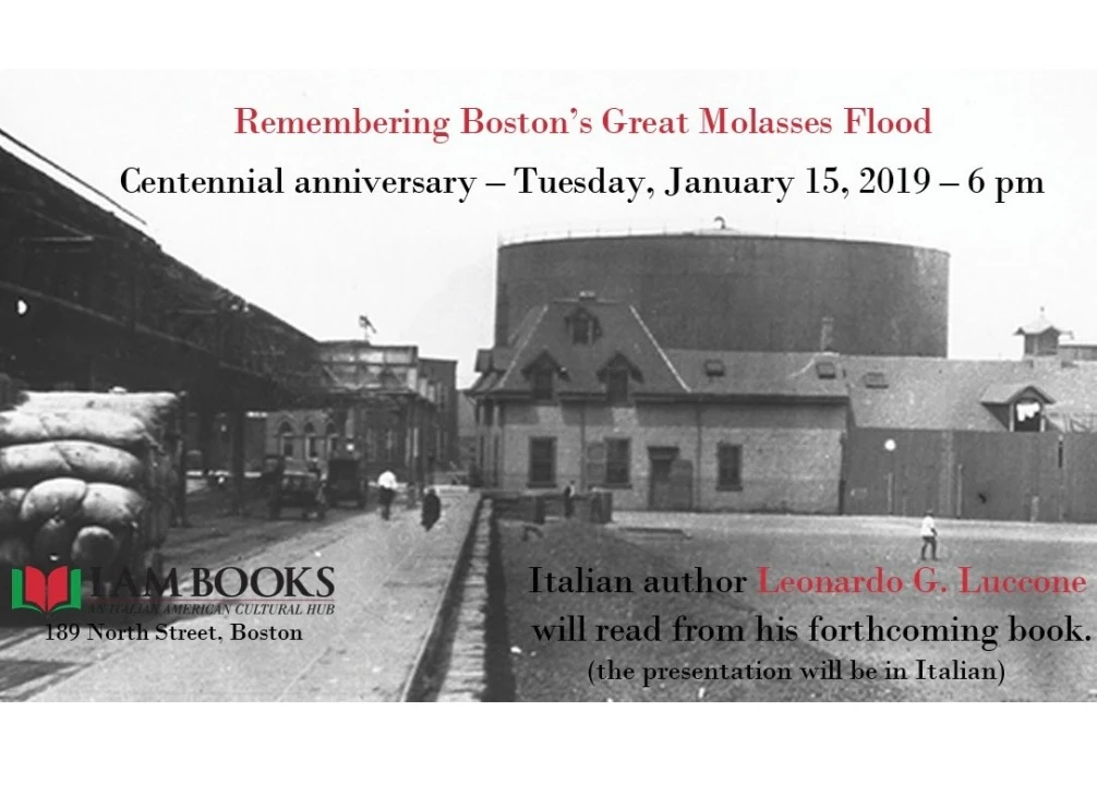 January 15 - 6 p.m. IAM Books - 189 North St, Boston 02113. Leonardo Luccone – Remembering Boston’s Great Molasses Flood. Sugary-sweet molasses turned deadly on January 15, 1919, when a holding tank burst and sent 2.3 million gallons of the sticky liquid sweeping through the streets of Boston.