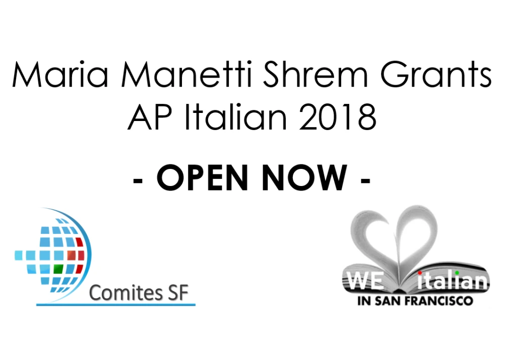 Iscrizioni aperte fino al 30 aprile per le Maria Manetti Shrem Grants 2019. Ad annunciarlo è la Commissione Lingua e Cultura del Comites di San Francisco, ricordando che le borse di studio sono destinate agli studenti che affronteranno l’esame Ap Italian. In base ai loro risultati verranno assegnati premi da 50 a 100 dollari.