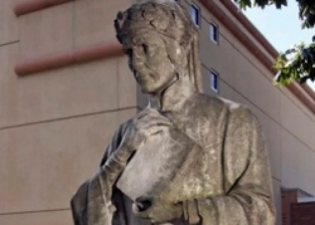 Tucked away in a quiet corner of the University of Scranton's campus near the Scranton Estate stands a statue of Dante Alighieri. The average passer-by may mistake it for a statue of a saint or priest; the white Carrara marble statue depicts a 7-foot, 6-inch figure in flowing robes clutching a book. Only the name, chisled in large capital letters at the base of the 5-foot-high plinth, reveals the statue's identity.