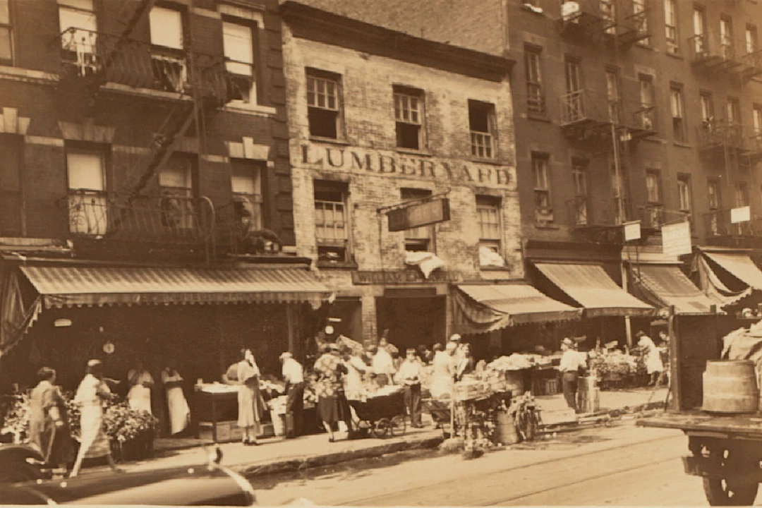 I don’t know if it was ever officially considered a Little Italy. But in the 1930s and 1940s, East 29th Street between Second and Third Avenues was an Italian food store stronghold. V. DiPollito’s meat market; Peter Rossi’s salami, olive oil, and baccala; a fruits and vegetables grocery; and a delicatessen/bakery are just some of the ground floor tenement stores with untidy cloth sidewalk awnings crowding the south side of the block.