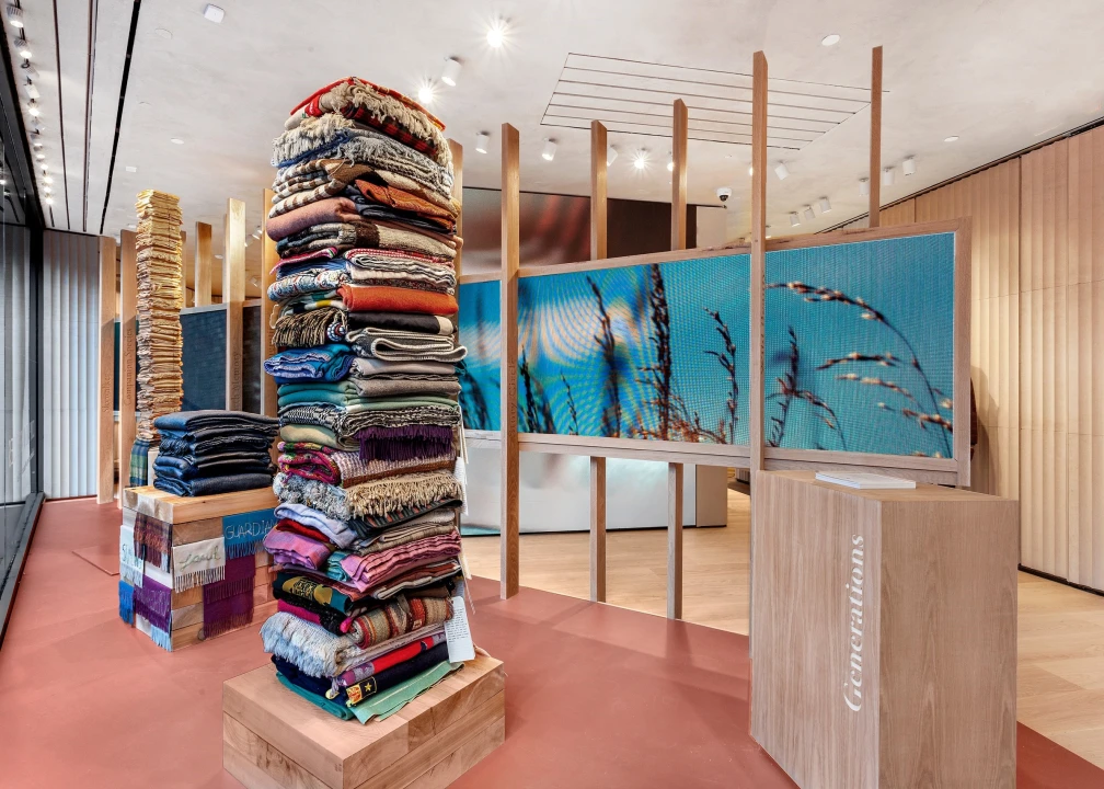 But perhaps the most striking component to Loro Piana’s new retail concept, outside of the decor and beautiful clothes, is a special art installation created by Marie Watt. A citizen of the Seneca Nation, her work explores the intersections of storytelling, community, and history within Indigenous teachings, culminating in contemporary sculpture and textile art.